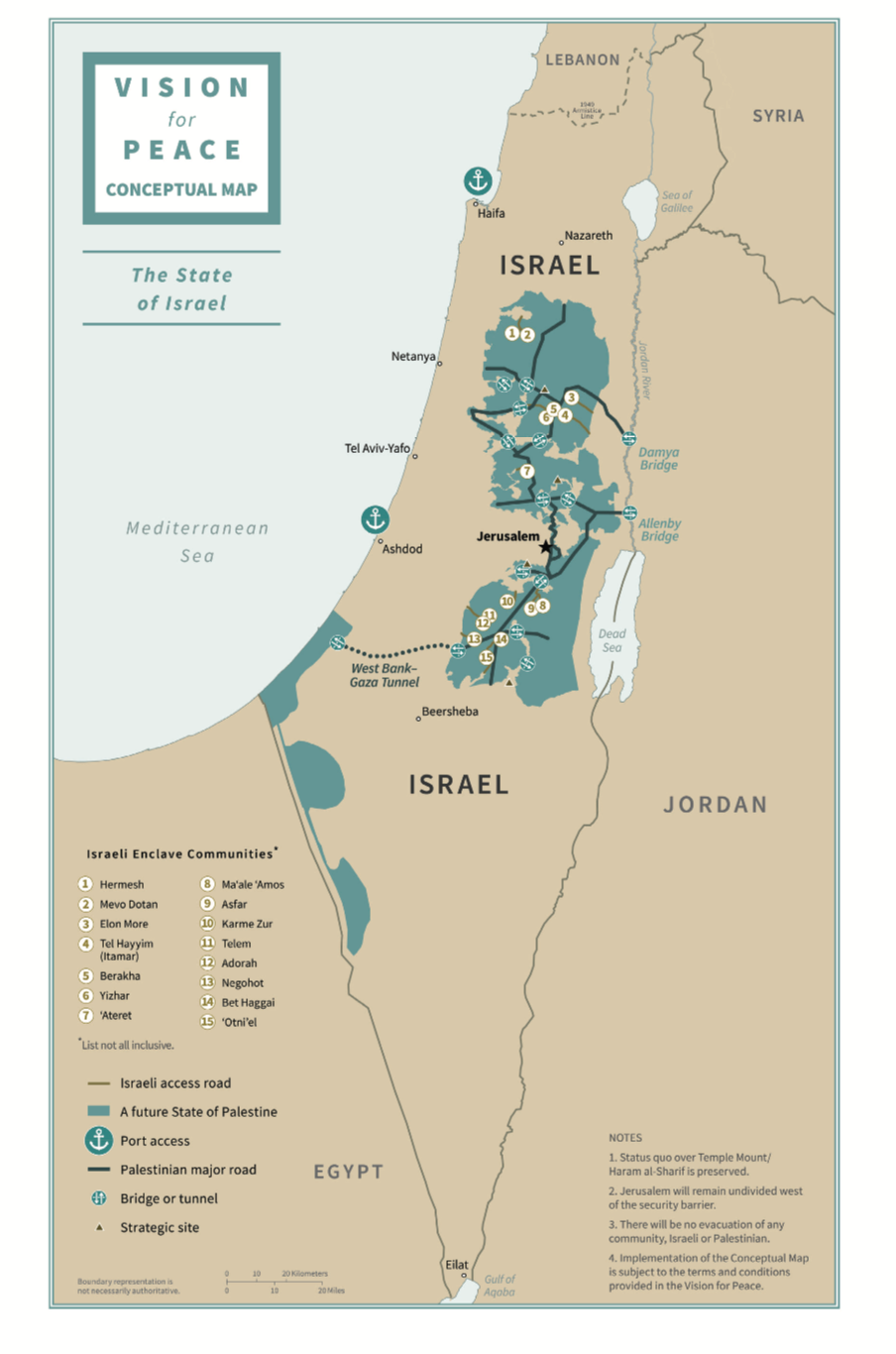 The plan touts a variety of enormous hypothetical investments which would be made in the Gaza strip, should Hamas agree to disarming ceding authority over the enclave. This bizarre amalgamation of proposals for Gaza (many of which are recycled from previous negotiations and have been firmly rejected by Palestinians) includes hundreds of millions of dollars proposed to revamp the Gaza Power Plant (bombed by Israel in 2014); a proposal is made to construct an artificial island off the coast of Gaza five years following the signing of a deal to create ‘The Gaza Port’ (which would concurrently render defunct any Palestinian access to the existing ports of Haifa and Ashdod), as well as a small airport for the Gaza strip (the existing airport which was built in 1998 following the Oslo Accords was shut down in 2000 and destroyed by bombing in 2001). Palestinians in Gaza are promised an expansion of the enclave, to include two subsequent ‘territories’ (conceptual map)which will become new hubs for industry, agriculture and housing – failing to mention that these proposed areas of land are in fact nuclear waste sites. A specially constructed underground tunnel linking Gaza and the West Bank is proposed to stich the territories together, allegedly creating a unified Palestinian state. All the while, Israel will retain full control of the parameters of the Gaza strip, including retaining control over the sea surrounding the coastal enclave.